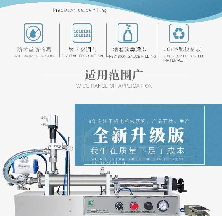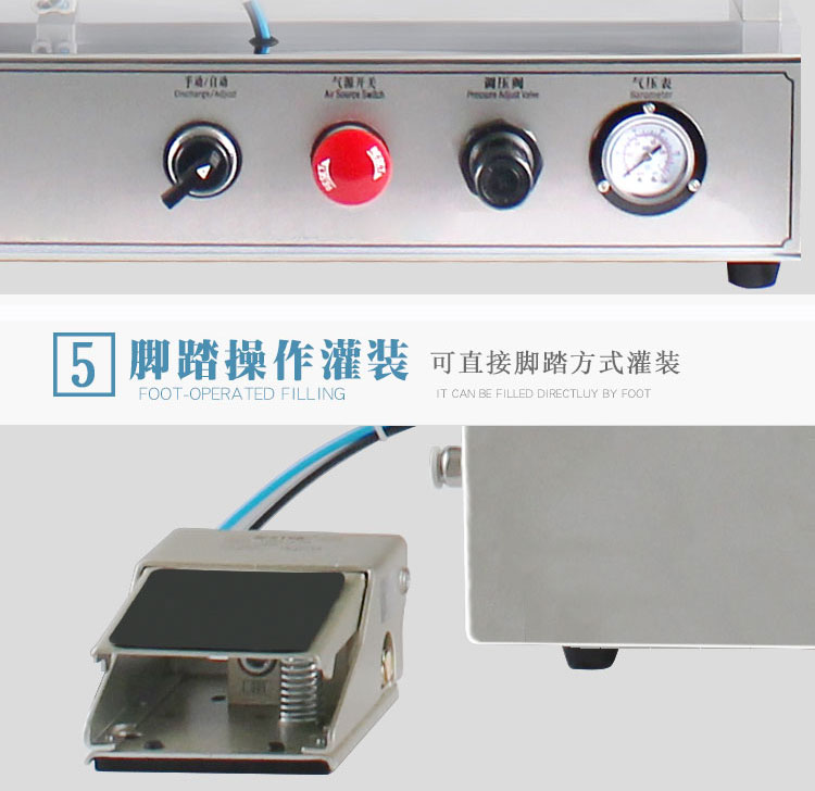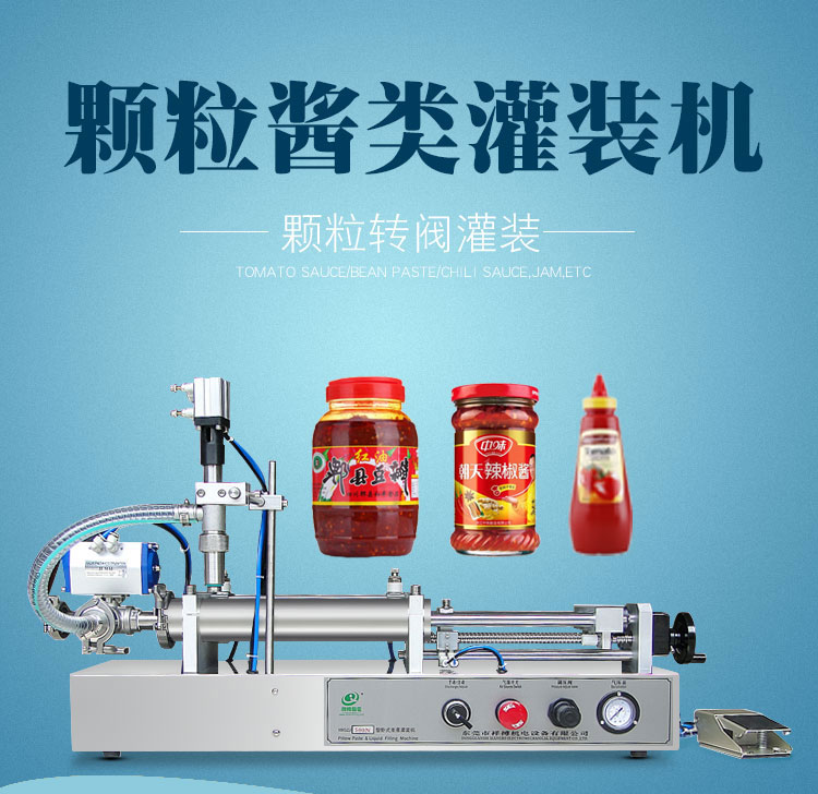 注:本机可选择定做灌装容量,可灌装0.5-5L,适用于辣椒酱、豆瓣酱、沙拉酱等含颗粒状的液体、半流体物料。该机主要动力为气源,客户需自备空压机设备。