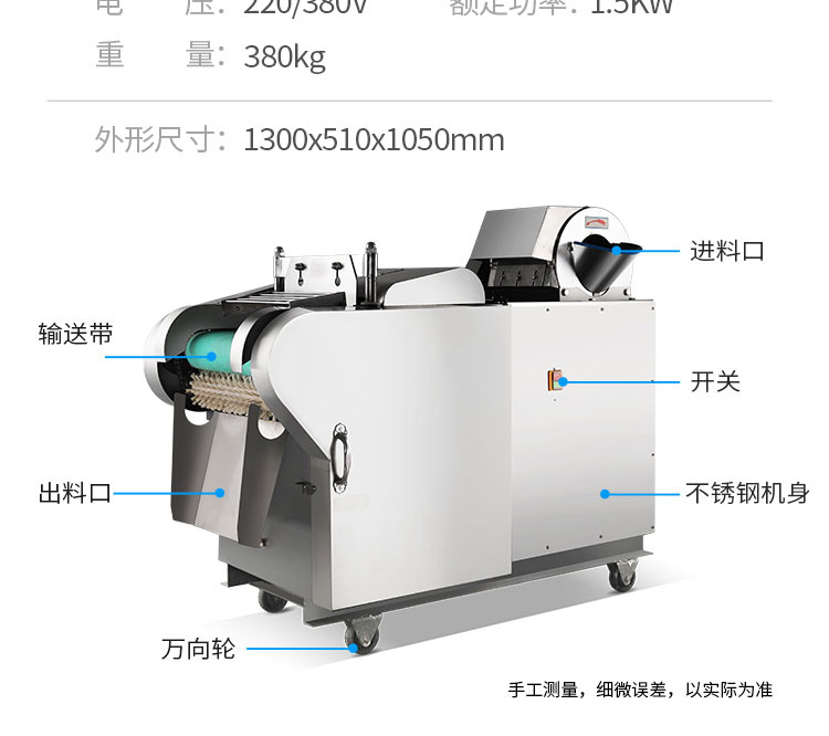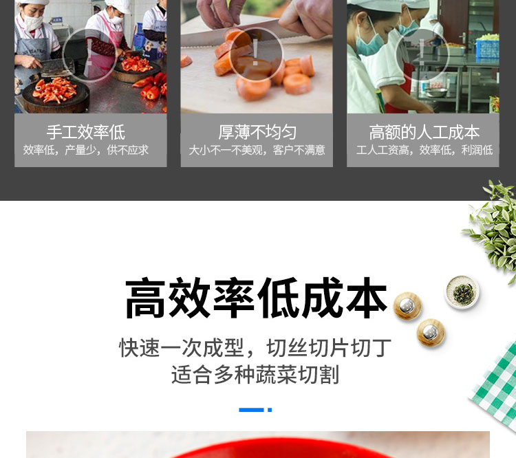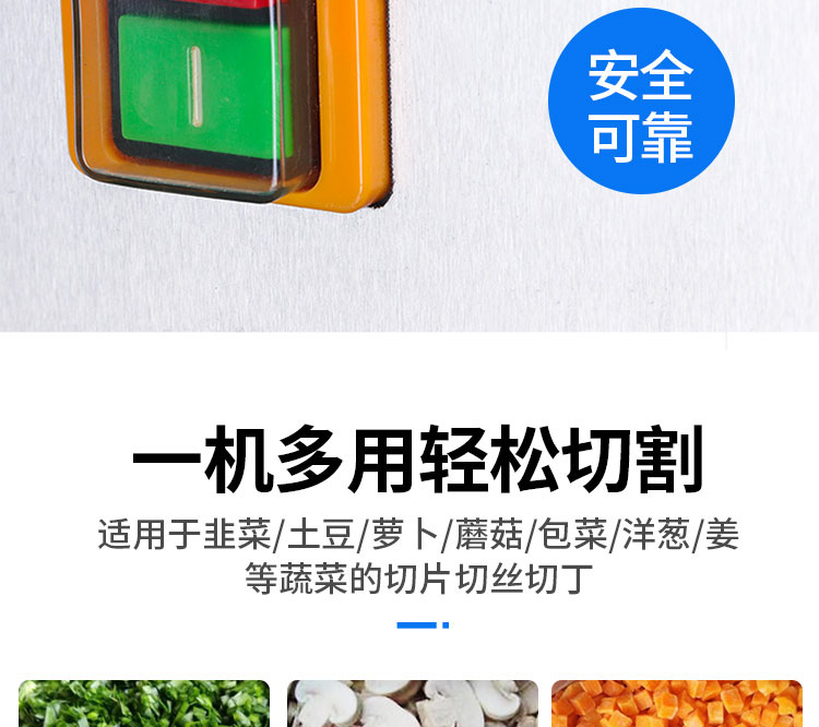 用于硬、软各种根、茎、叶类蔬菜和海带的加工,可切制片、块、丝、丁、菱形、曲线形多种花样。