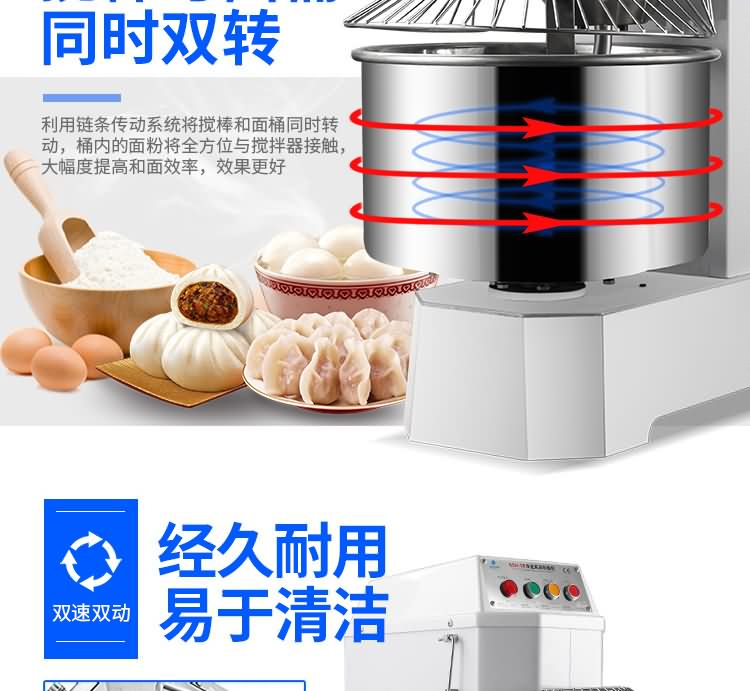 双动双速和面机是采用皮带、链条和链条传动变速,和面杆搅拌桶同时作旋转运动,该机设计合理,外型整齐美观,体积小,重量轻,噪音小.效率高,操作简单,清理方便,清洁卫生,经用户使用反映良好。该机适用于公共食堂、旅馆、宾馆、饭店、部队、招待所及学校部门等揉制面团和搅拌食物的理想加工机械。