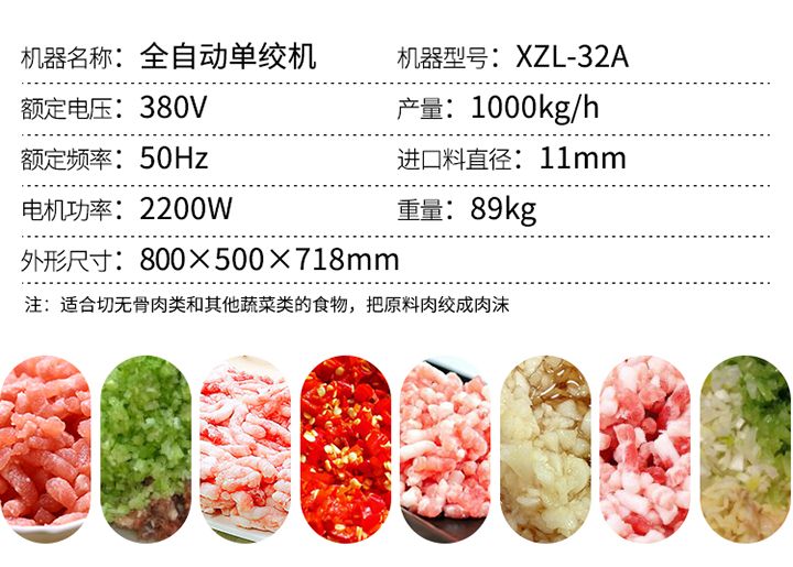 XZL-32A单绞机吸取同行之优点,改进新型绞肉切肉机械,它能切猪肉、羊肉、牛肉、鱼及其它各种肉类、所切肉片厚度适中切片效率高,是餐厅、宾馆、酒楼、单位食堂等绞肉切肉的理想机械,该机外形独特,操作方便,维修简单,工作效率高,在同行业中处领先地位,与食物接触部分均采用不锈钢制造符合食品卫生标准。