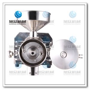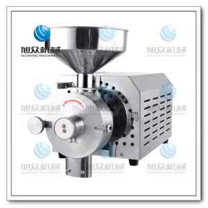 磨粉机的电机启动运转时,连接轴以及套在连接轴上的磨盘一起运转。待磨物料从料斗进入磨粉套,磨盘的绞龙和磨粉套之间的相对运转,破碎力使物料绞碎成小块颗粒,绞碎后的小颗粒在磨盘绞龙的螺旋运动下被带进两块磨片中间,磨片齿纹的相对运转,使物料在短时间内被粉碎成细小的粉状颗粒,粉从磨片的齿沟流出,甩向四周,同时被装在磨盘上的刮粉板带下,从出粉口流出来。