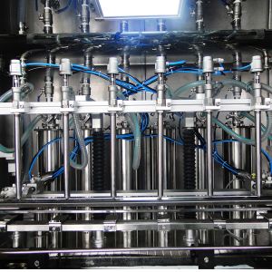 全自动伺服灌装机是在传统灌装机的基础上,采用伺服电机代替气缸驱动主活塞,灌装头也由伺服电机带动升降。