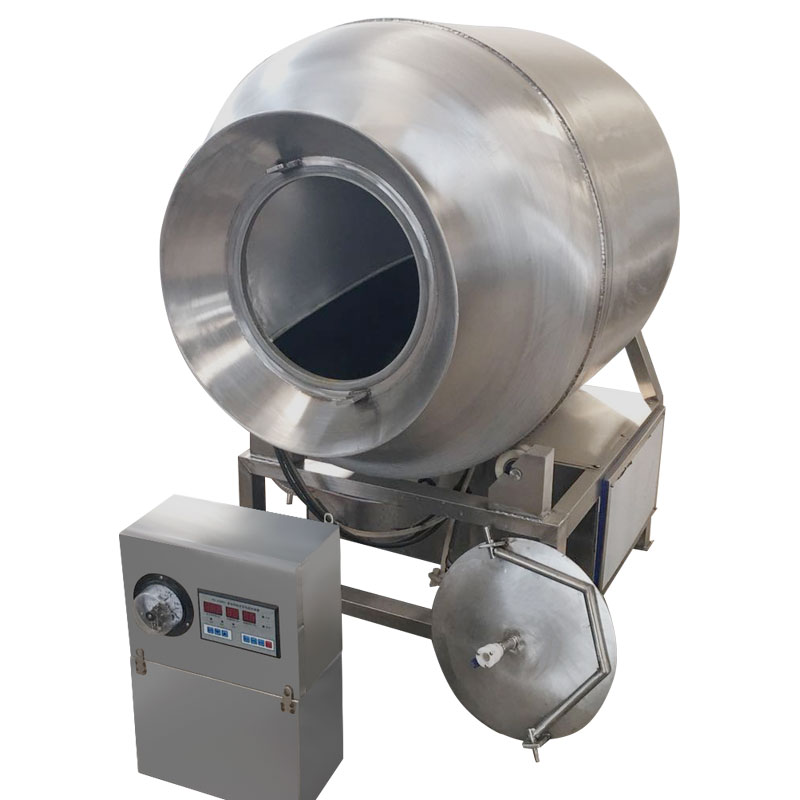 真空滚揉机是在真空状态下,利用物理冲击的原理,让肉在滚筒内上下翻动,相互撞击、摔打,达到按摩、腌渍作用,使肉均匀的吸收腌渍,提高肉的结着力及产品的弹性,通过滚揉、 按摩能使肉体蛋白质分解成水溶性蛋白,易被人体吸收,同时能使添加料(淀粉等)与肉体蛋白质互为融合以达到肉质变嫩,口感好,出口率高。真空滚揉机具有肺呼吸功能,让产品在滚筒内膨胀,缩小了往复运动,改善了肉组织的结构,提高了切面效果。本机采用支架普通不锈钢,滚筒(接触食物部分)选用食品级304不锈钢材质。