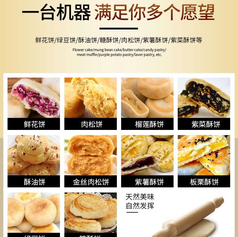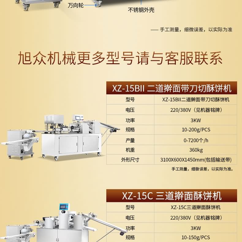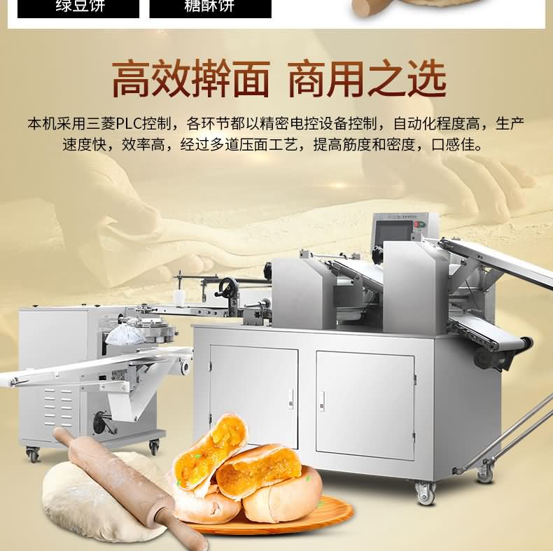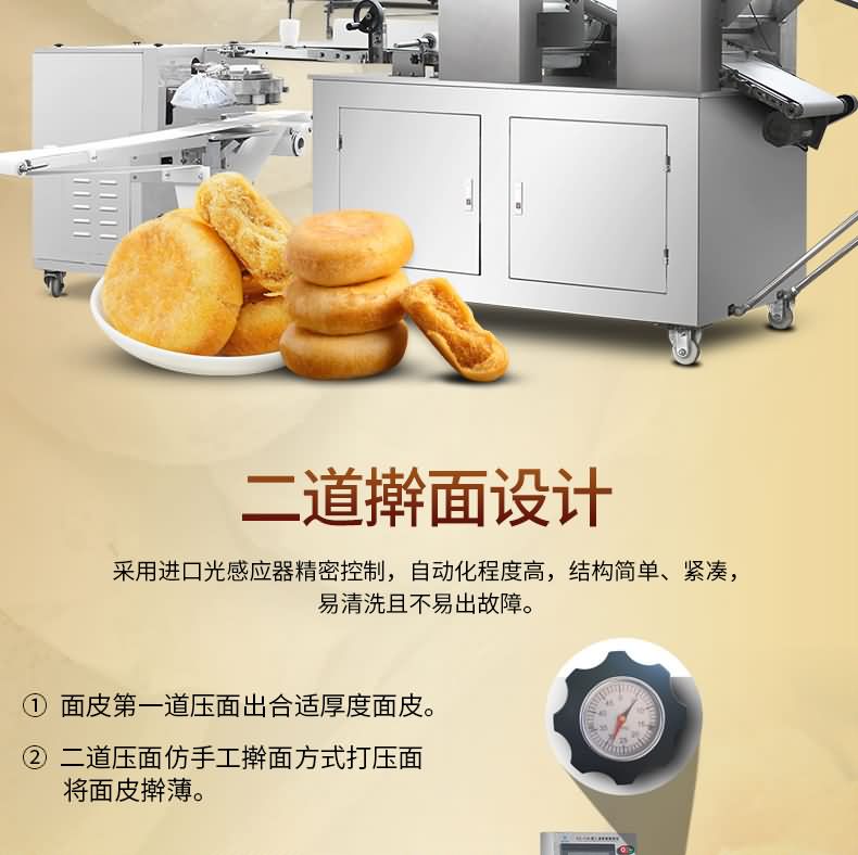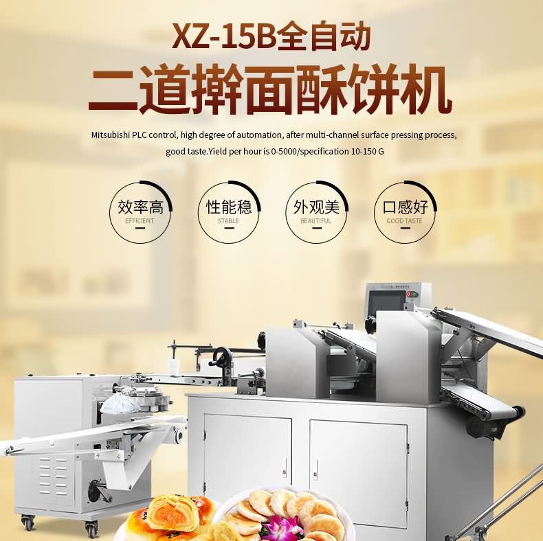 XZ-15B二道擀面酥饼机,生产速度快、效率高、生产流程流畅,各环节都辅以电控设备控制,不会出现堵面、破酥等现象。可生产苏式月饼、肉松饼、老婆饼、厦门馅饼、金华酥饼、拉丝面包等等特色酥饼,适用于大、中型糕饼生产厂家,免费提供工艺技术。