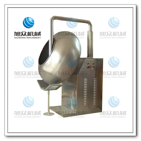 简易包衣机是对中、西药片片芯外表进行糖衣、薄膜等包衣的设备,是集强电、弱电、液压、气动于一体化,将原普通型糖衣机改造的新型设备。主要由主机(原糖衣机)、可控常温热风系统、自动供液供气的喷雾系统等部分组成。主电机可变频调速。它是利用高雾化喷枪工作时,高压空气流在喷枪内腔形成负压,包衣液在大气压的作用下高速雾化喷到药片表面上。同时药片在包衣锅内作连续复杂的轨迹运动,使包衣液均匀地包在药片的片芯上,锅内有可控常温热风对药片同时进行干燥,使片药表面快速形成坚固、细密、完整、圆滑的表面薄膜。