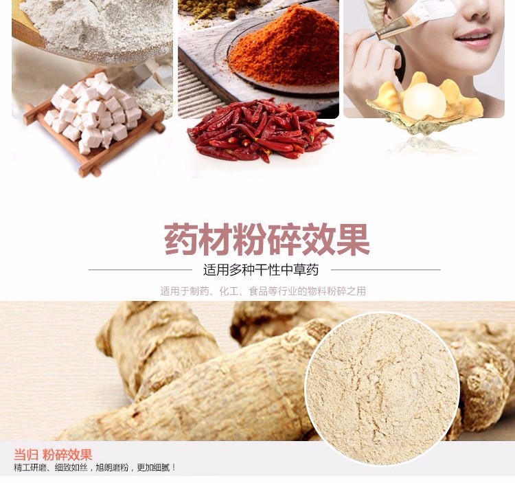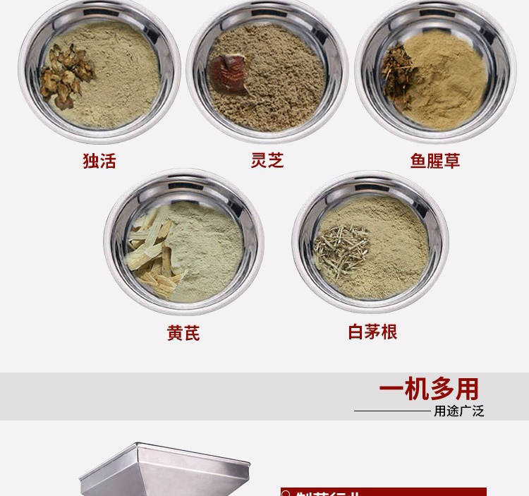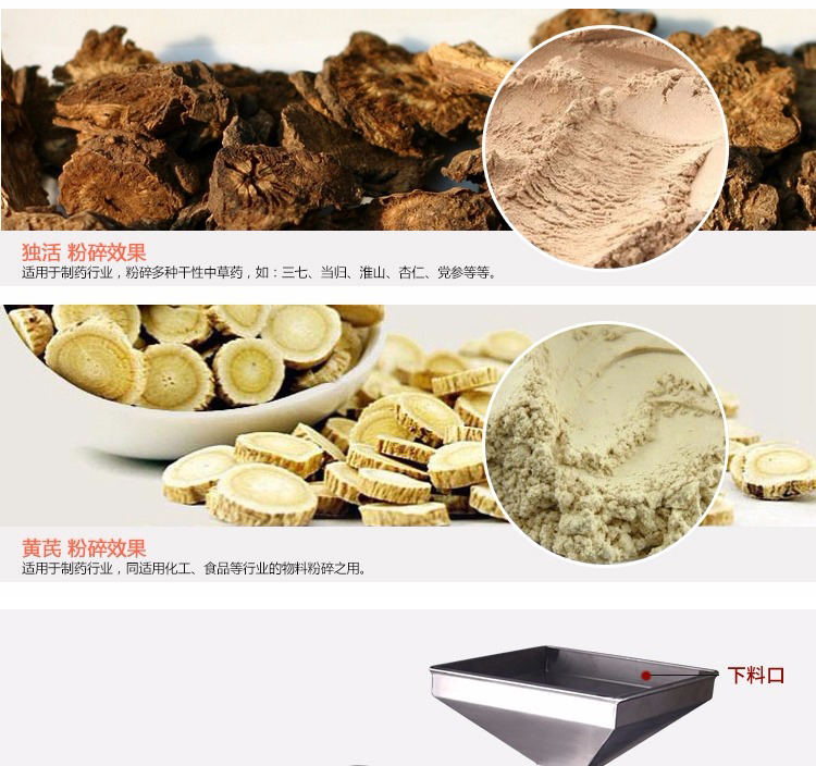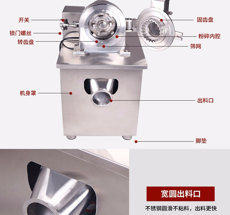 粉碎机系采用304号不锈钢制作,配套国标电机,主要用于化工材料、中药材含树根、树枝以及块状类物料、各种含油量不高的粮食、五谷杂粮以及其他一些硬性、脆性的物料。本机利用活动齿盘和固定齿盘间的相对高速运转,使被粉碎物经齿盘冲击、摩擦及物料彼此间碰撞而获得粉碎。粉碎物可直接从磨腔中排出,经出料口出来,一般的物料经过粉碎后要经过棉布袋来收集,粉碎后的物料收集在袋内,空气则从布袋的细小孔眼出来,不会将细粉排出,从而起到不浪费,不污染的效果。粒度大小由更换不同目数的筛网决定。本机结构简洁、坚固,运转平稳,粉碎物料快速、均匀,效果良好。本机全为不锈钢材料制作,机壳内部(粉碎槽)所有齿槽经精密机加工从而达到表面平滑,易于清理,改变了普通粉碎机内壁粗糙、易积粉、难清理的现象,使食品、药品、化工等生产更能符合标准,达到GMP的卫生要求。