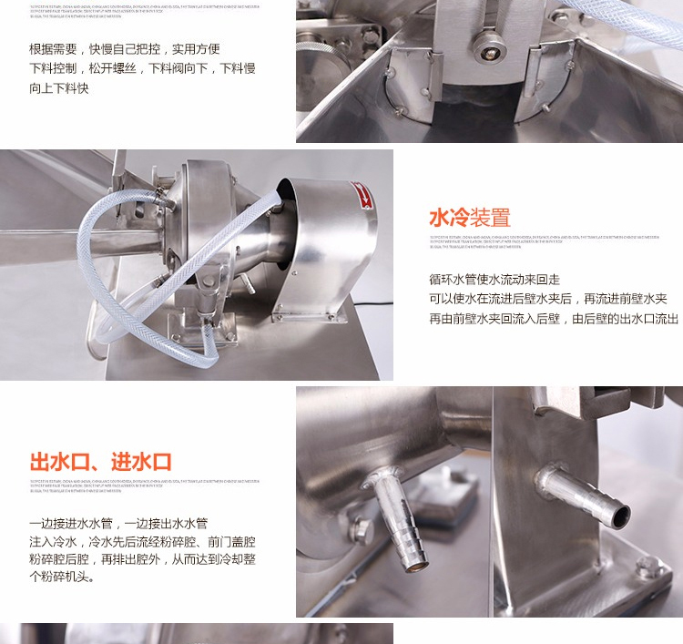 2、水冷装置为在粉碎腔的外圈,以及粉碎腔门盖和粉碎腔后壁,人为设置了密实的空腔,注入冷水,冷水先后流经粉碎腔、前门盖腔、粉碎腔后腔,再排出腔外,从而达到冷却整个粉碎机头,降低粉碎腔温度的目的。