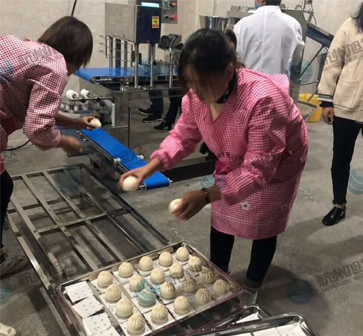 食品厂专用包子馒头机做包子、馒头,多功能包馅机做青团,两台机器搭配使用,产量是跟上了,不过好像还是需要人员帮忙去摆盘等等后续工作,那么我们来看看它们齐聚一堂是如何分工合作的状态: