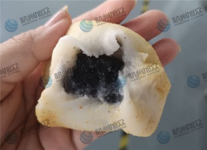 馅料的话也是客户自己拌好带过来的,这是最开始的黑芝麻白糖馅,就像一堆散沙一样没有一点流动性,这样的馅料没办法通过机器包馅的,因为客户也是需要用机器代替人工来包馅成型,于是愿意稍微改变点工艺