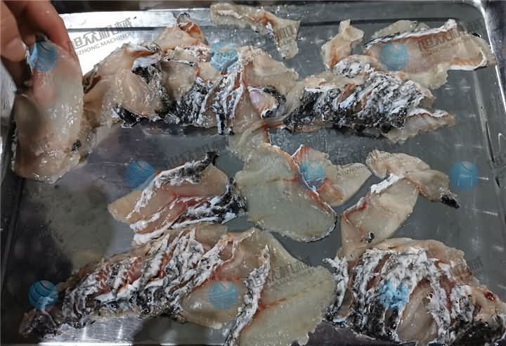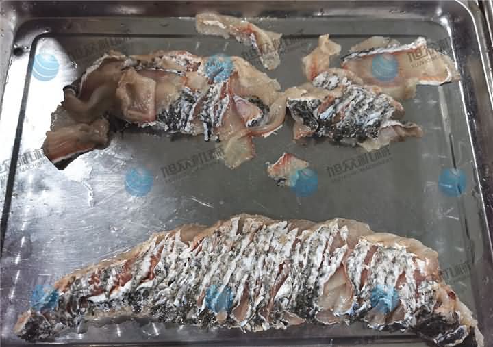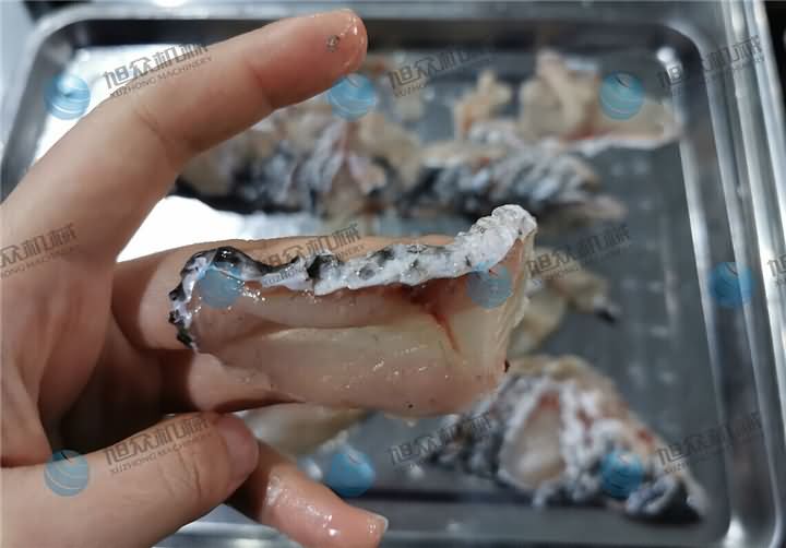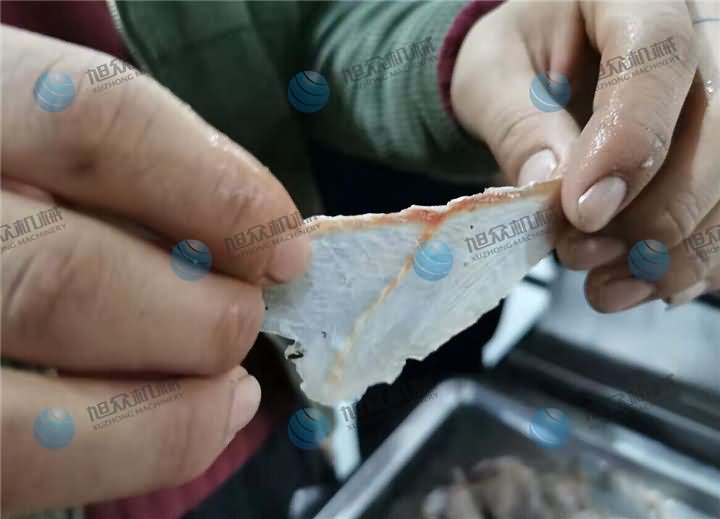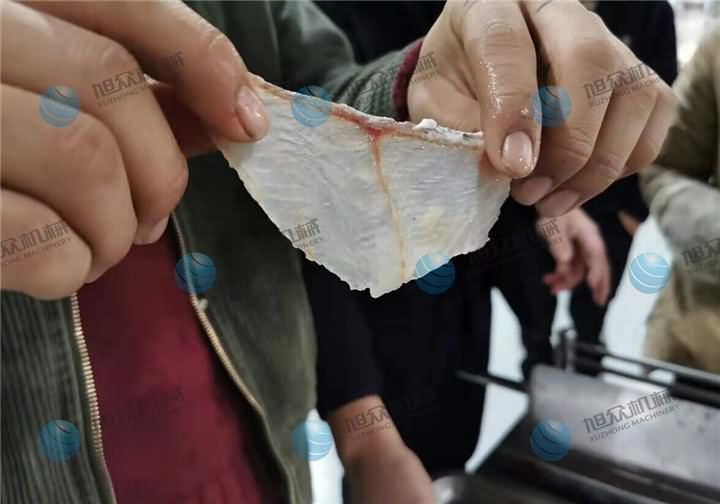 斜切鱼片机操作非常的简单,这不是骗人的哦!前天有客户来试切鱼片机,刚好试机师傅再试另一台包子机,为了减轻同事们的压力,于是作为摄影师的我亲自上阵,因为我拍过很多视频,看过无数遍师傅们的操作过程,于是我便先拿起客户带来的黑鱼,去完鳞分半的那种,不过发现大的鱼骨没有剔除,对于第一次接手的我来说,剃鱼大骨也是需要一门技巧,花了些时间将鱼骨剃掉后,放在送料板上放点水润滑下,送入鱼槽中,开启开关等个十几秒鱼片就切好了。客户看了效果后带回去给大厨看了之后,今天就转账定购设备了。他说【不光是切鱼片机切出来的鱼片效果好,还有一个原因就是操作简单,他也知道我第一次上手试切鱼片机,在没人帮助下就能完成,这样以后如果来新人也能很快的上手】