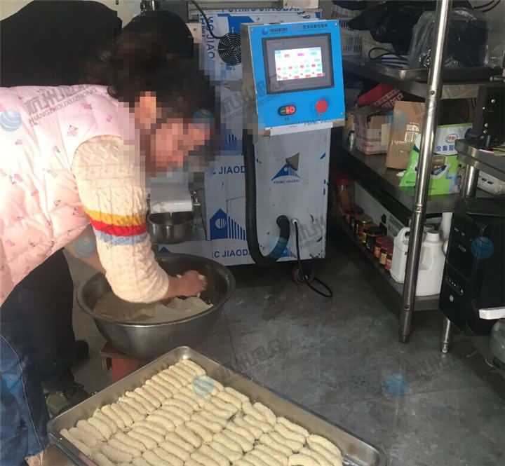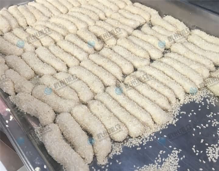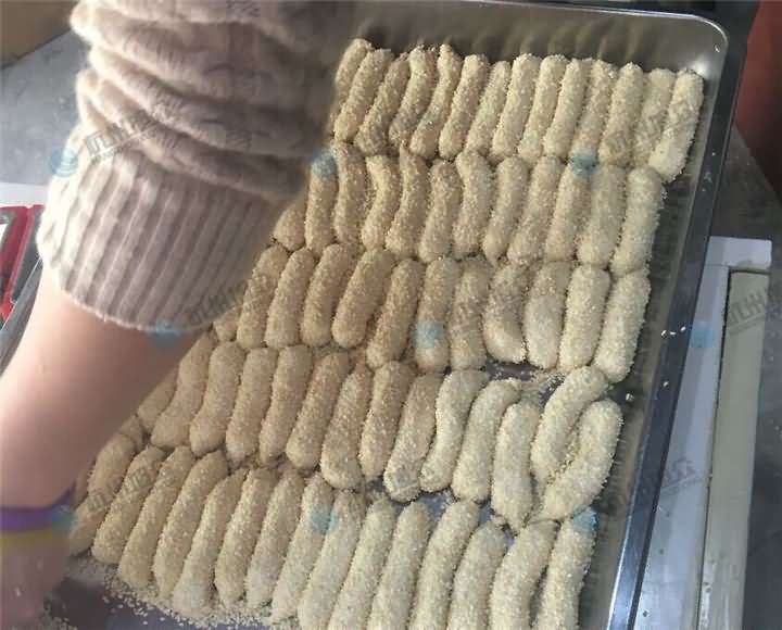客户真心想要设备来代替人工,那么不论它的价格,只要实用就购!麻球除了是圆的以外,还能生产长方形的,不过长条的麻球在当地是叫油蛋,那么我们来看看包馅机做的长条油蛋是什么样的吧!