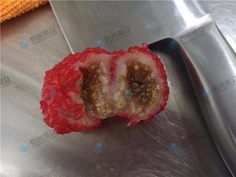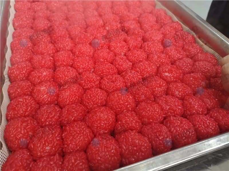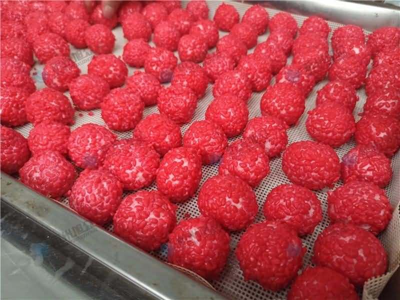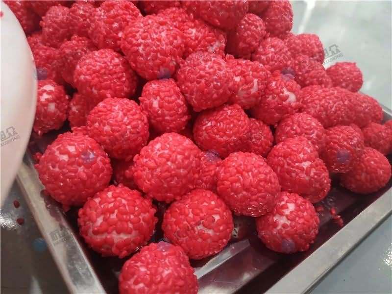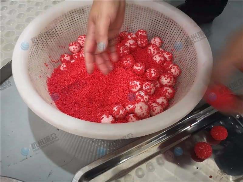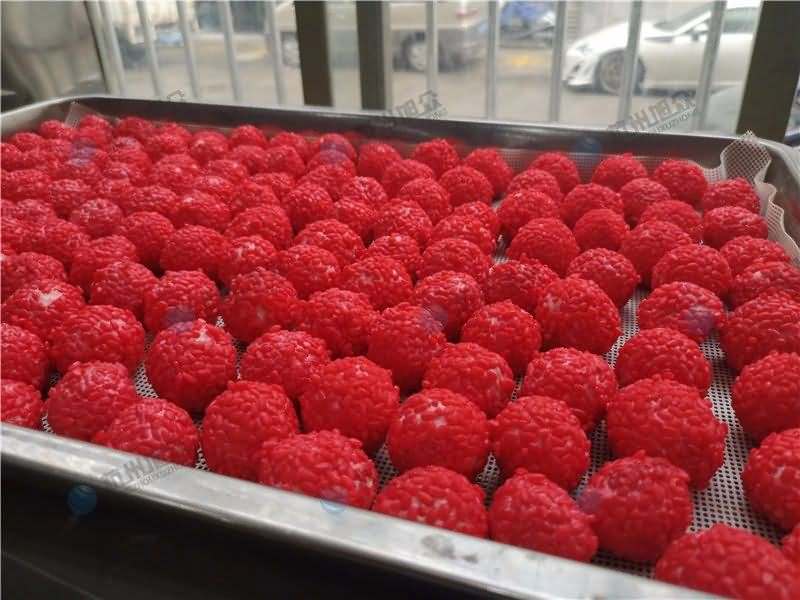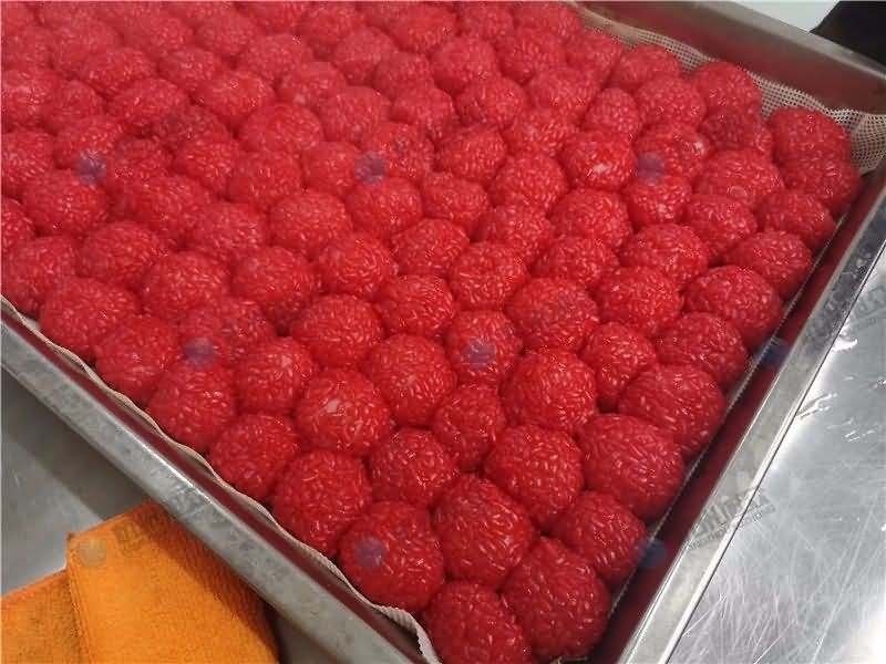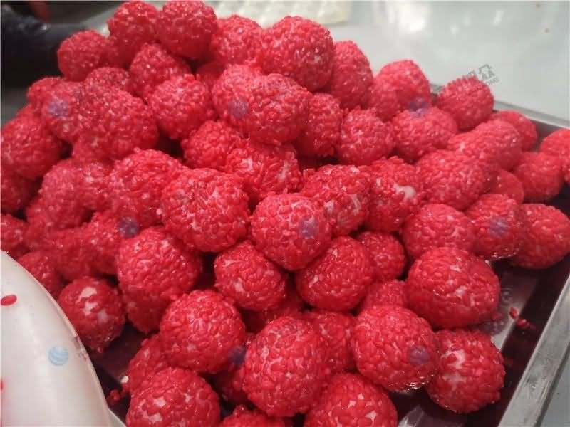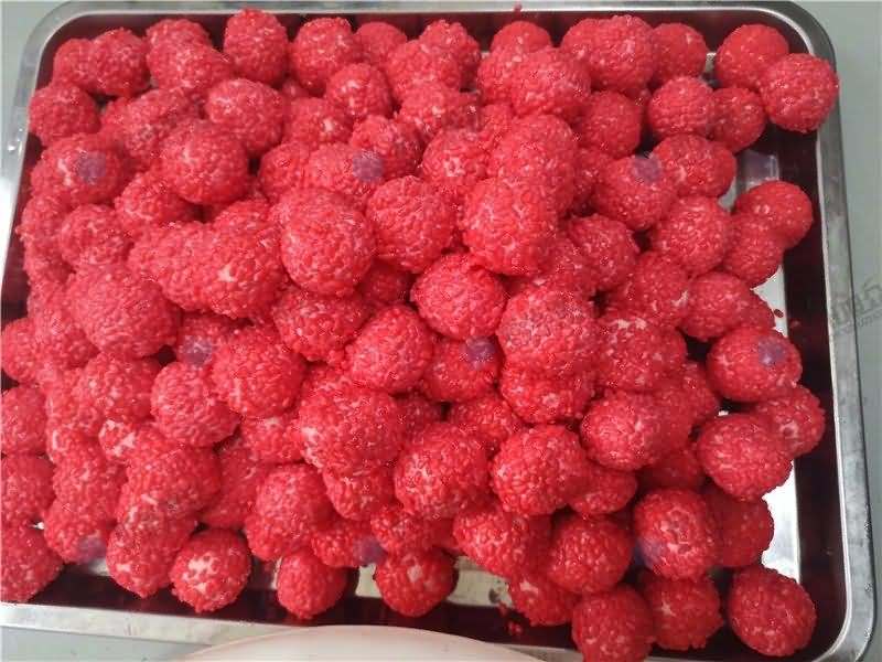 因为馅料、面皮都可是客户自己准备带来现场的,所以直奔主题,需要搓圆做成团子形状,之后再人工裹红米,因为不带摆盘的VFD-4000A汤圆机当时没有样机,所以安排VFD-4000汤圆机(带摆盘)做团子。