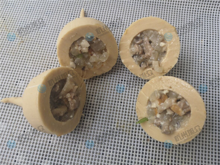 步骤三:馅料用搅拌机搅拌好后放入包子机馅斗中,和好的面团放入包子机面斗中,调整好面皮克重后再充馅,批量生产地瓜包: