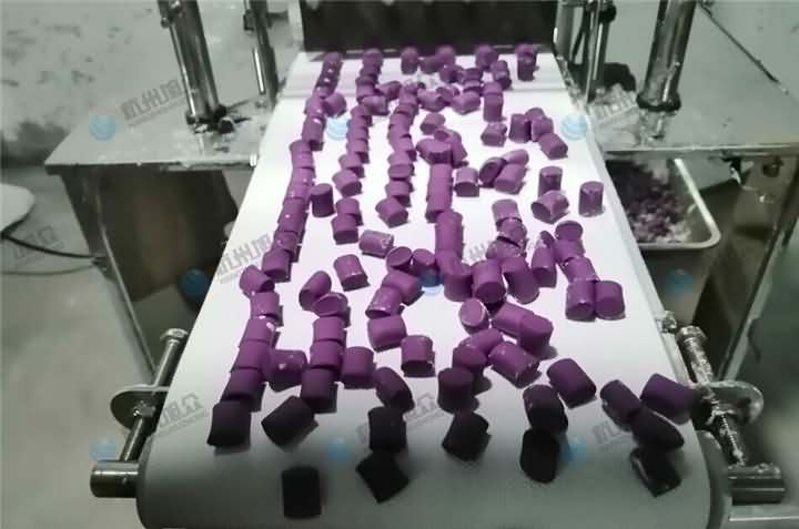 紫薯芋圆究竟是用汤圆机还是芋圆机呢?以往我们客户做的芋圆都是方方正正的那种,近期有某个客户也是做的紫薯芋圆,自然而然就给他推荐了芋圆机,当他带着做好芋圆来到我司后,发现原来他做的紫薯芋圆却是圆形的,如果是圆形的芋圆那就不好再用芋圆机去生产,转而选择VFD-1200汤圆机。那么汤圆机制作的紫薯芋圆是怎样的呢?