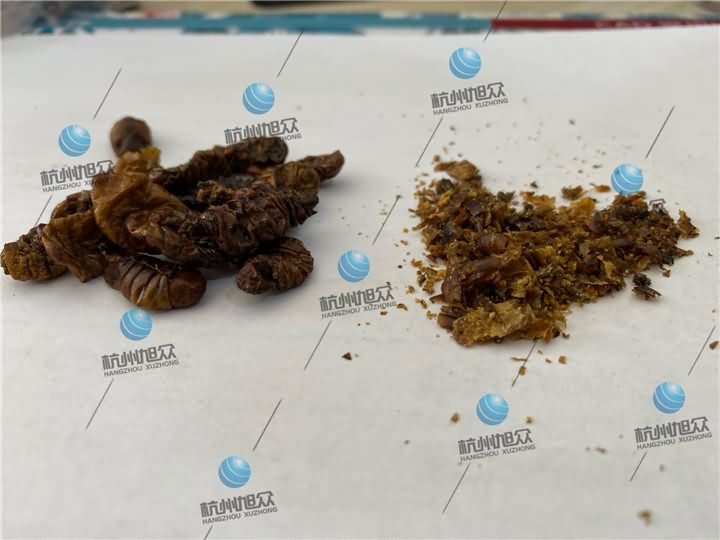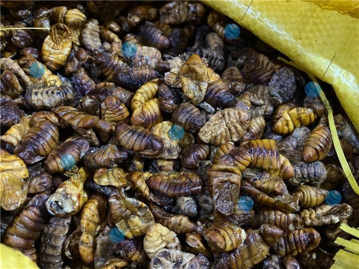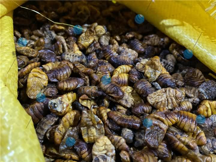 蚕蛹烘干前体内油脂甚多,有些肥硕点一捏就出汁: