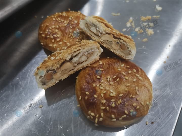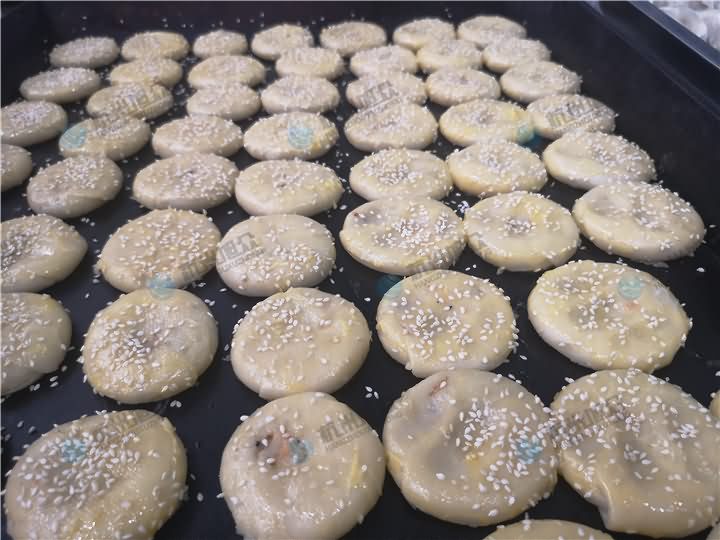 第二张图是酥饼机批量生产的酥饼,再由人工后期抹一层蛋黄再撒上白芝麻