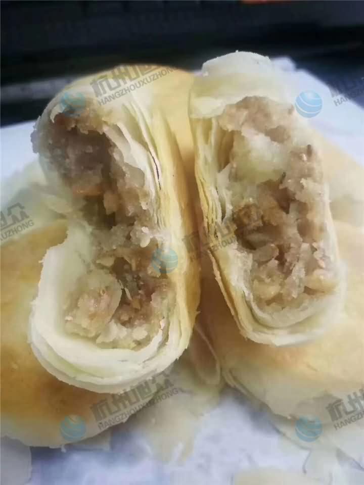 全自动酥饼机自动卷皮包馅成型酥饼,烘烤后的酥饼掰开能看到层层分明的酥脆饼皮,丰富的馅料,酥饼香脆,任谁看了都要忍不住要把它们一个个都吃掉。