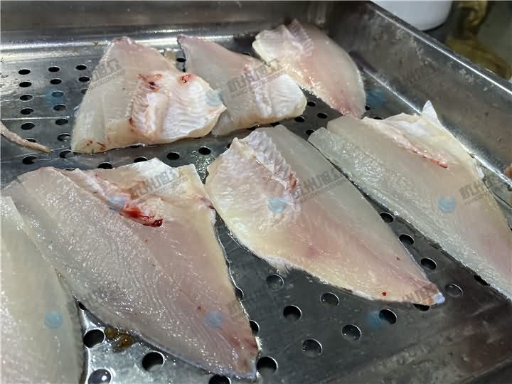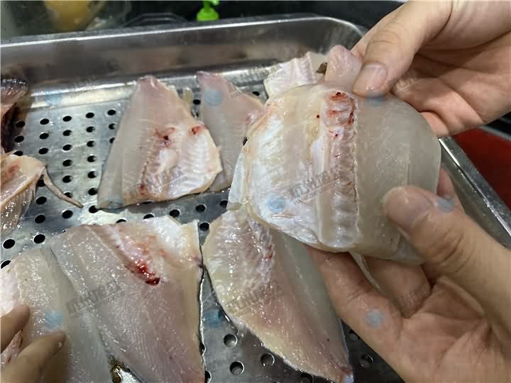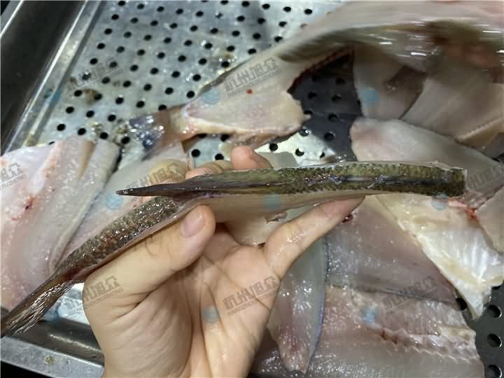 三枚开片去中骨杀鱼机就是将鱼中骨去掉,分割成三片,一般鱼加工食品厂流水线会用到该设备,不过在用去中骨杀鱼机前,先要将鱼鳞刮干净(或者选择去鱼鳞机刮鱼鳞)、去鱼头及去完内脏后再使用这台杀鱼机器。