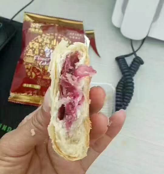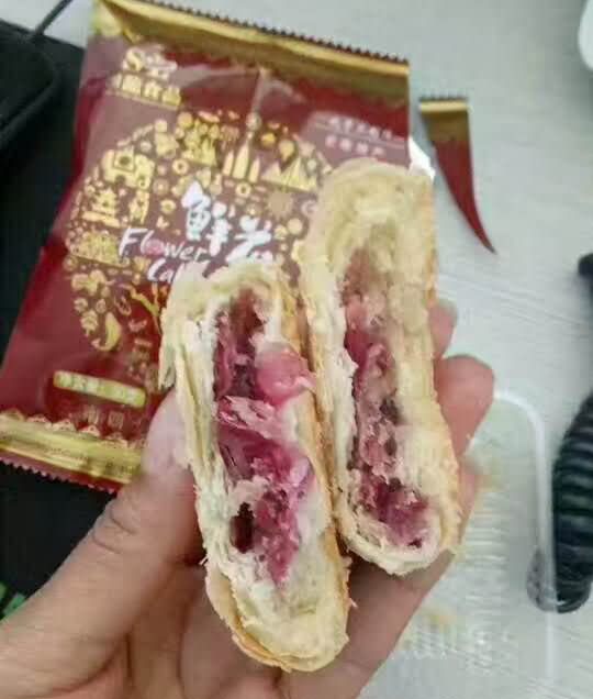 段老板前段时间买了我家酥饼机,今天客户给我们的反馈,就是送我们机器做的鲜花饼,口感棒棒哒!