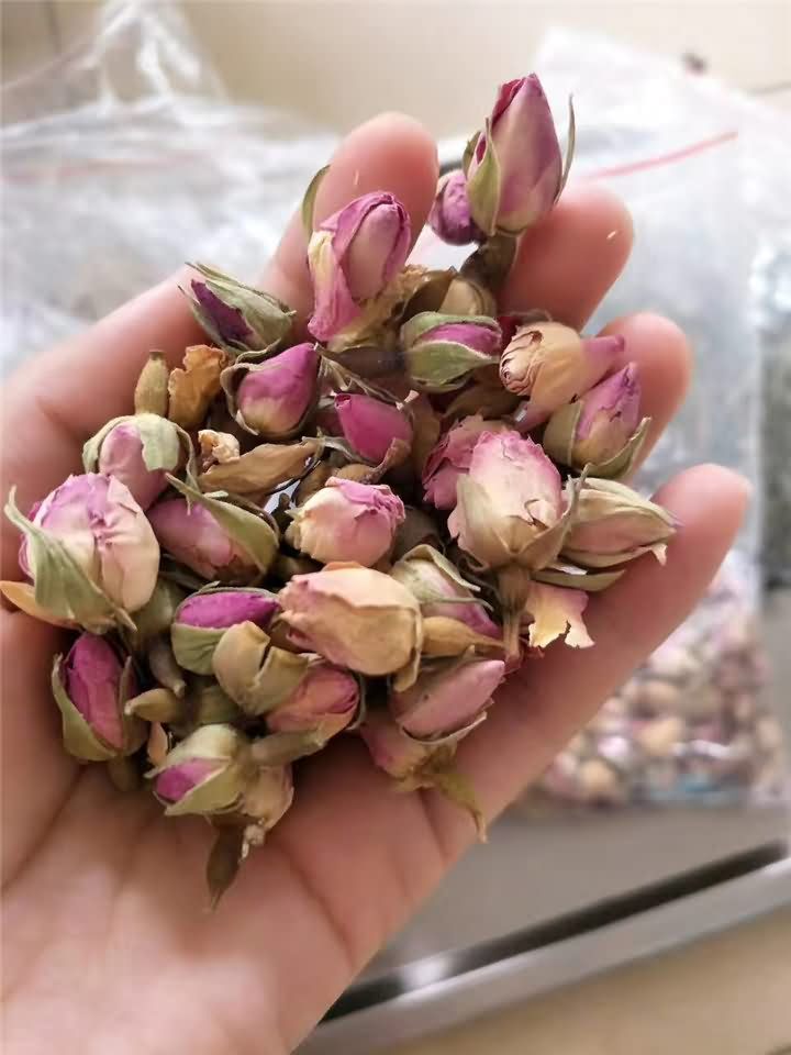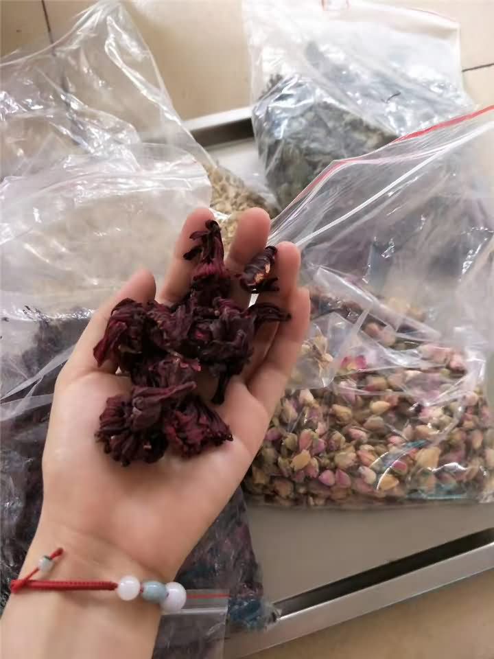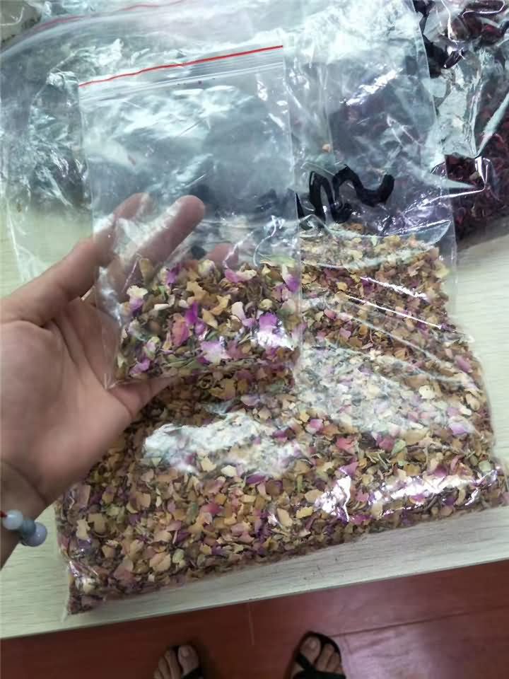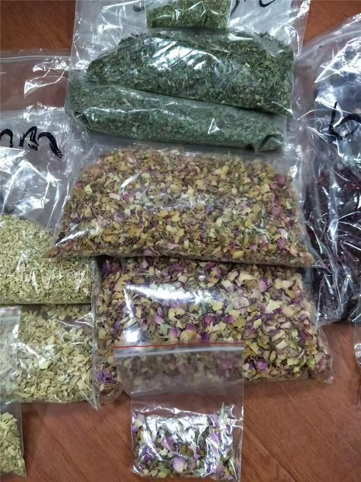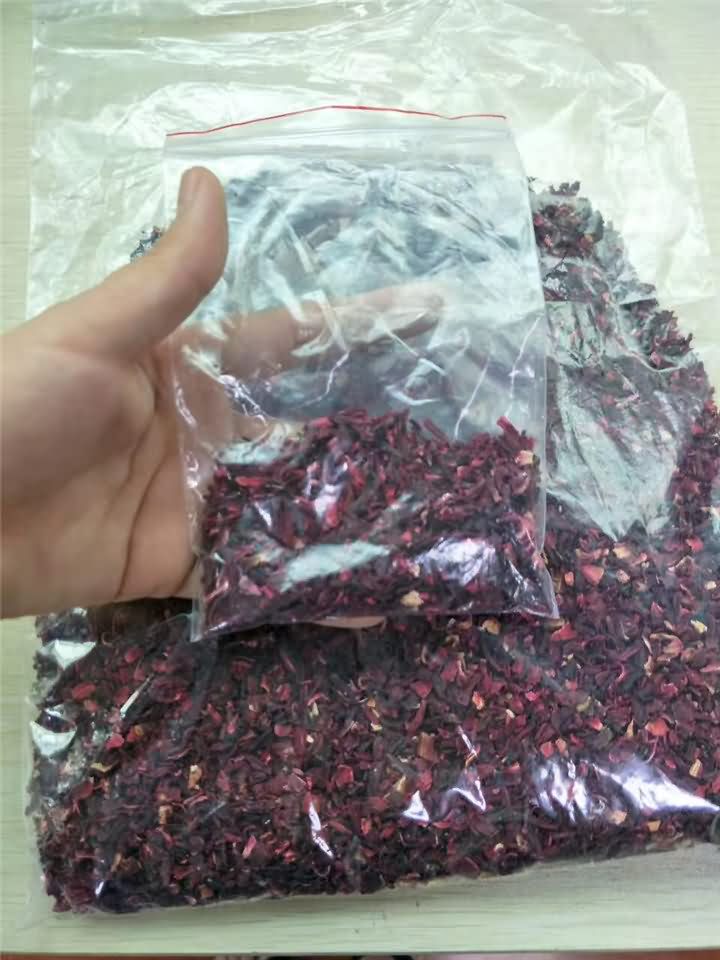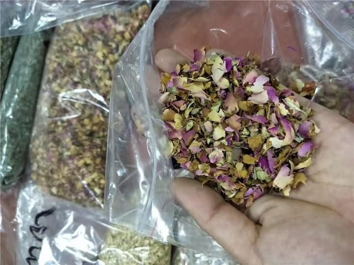 旭众不锈钢破碎机破碎筛网孔径标配6mm或者8mm,另可定制10/12/14/16/18/20/30,一般不定制小于6mm的孔径,远在新疆的刘老板寄了他家烘干好的玫瑰花等物料来到现场,并直观了用破碎机破碎后的效果: