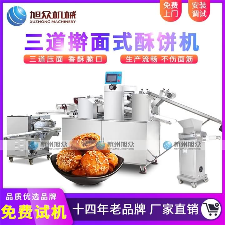 旭众酥饼机分别有两道擀面酥饼机,三道擀面酥饼机,然后两道和三道分别又有带刀切和不带刀切功能的酥饼机,于是酥饼机型号越来越齐全,根据客户需求来选择适合那款酥饼机,那么旭众酥饼机价格大概多少钱呢?酥饼机的价格从五万到六万多价格不等哦!仿手工制作面食产品的机型,占地面积小,重量轻,运用擀面杖压面和打击面团,以保证高面筋性和面带的密度,并综合考虑面食的口感而研发。可生产东北糖酥饼,东北大香酥饼,苏式月饼,芝麻饼,鲜花饼,老婆饼。