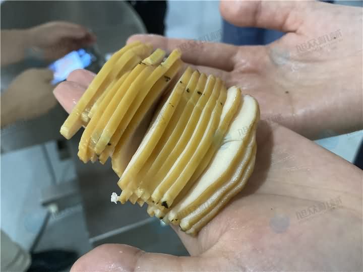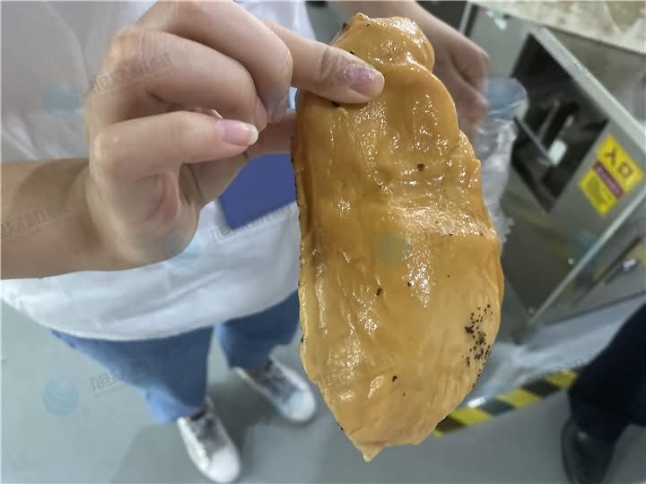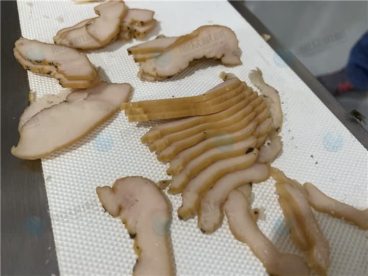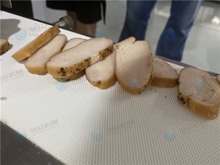 烟熏鸡胸切片优选熟肉切片机,鸡胸加工厂老板网上找到旭众熟肉切片机,听说机器可以现场演示,带了好几包烟熏鸡肉来到现场,熟肉切片机切鸡胸肉从10mm→6mm→3mm→2mm不断演变,最终调到客户满意的2mm的薄度,当场签定合同直接定购熟肉切片机,那么我们来看看熟肉切片机切鸡胸肉片的效果: