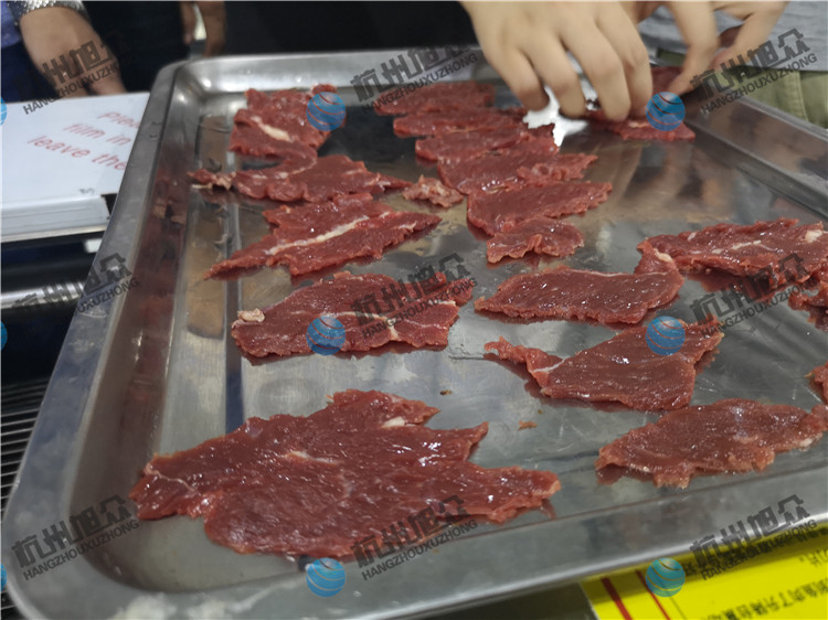 牛肉加工厂的福利,全自动斜切牛肉片/鱼片机适用于肉类加工厂,鱼类加工厂,大型餐饮行业等单位。全自动斜切鱼片机切2.5mm鲜牛肉片效果如图: