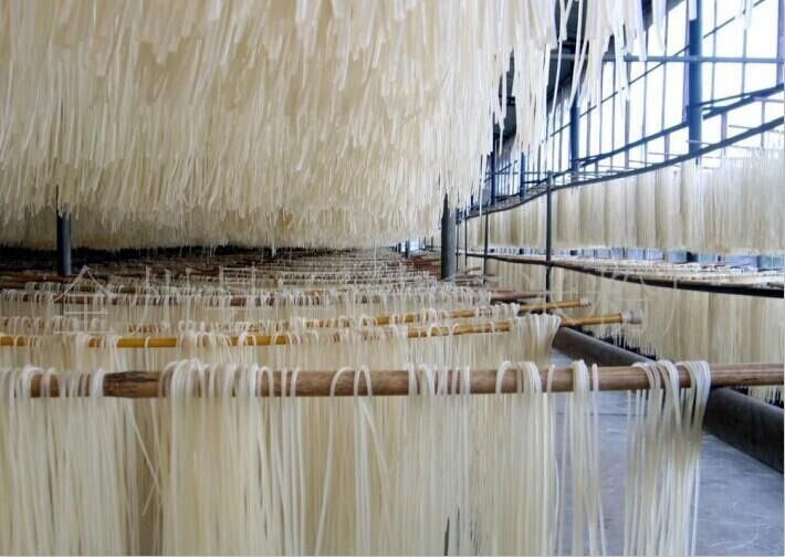 取大米60斤用净水浸泡1-2小时,用手一搓就烂就可磨成米浆(也可将大米浸泡30分钟,然后阴干表面水分磨成米粉,再用米粉调成米浆)。筋力源0.8斤与40斤淀粉干拌匀,加入米浆和匀,补充水分至总量45斤,和面糊至自然摊开为准。然后将和好的面糊放入自熟米线机挤丝、风扇降温,再放入凉棚熟化8-12小时、用水浸泡20-50分钟,然后搓散、阴干表面水分、包装、销售。