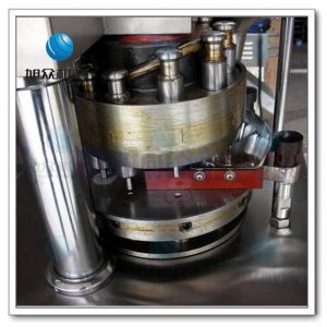 本机用以将各种颗粒状原料压制成圆形片剂,最适合于小批量生产。其特点是转盘上可装15-19付冲模,旋转一周即可压制15-19片。转盘速度、物料的充填深度、压片厚度均可调节。机上的机械缓冲装置可避免过载而引起的机件损坏。机体一侧配有吸粉箱,通过吸咀可吸取机器运转时产生的粉尘,避免粘结堵塞。