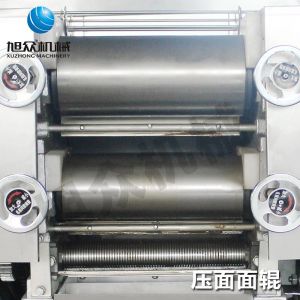 将搅拌好的面粉均匀的放进去,面对辊将松散的面粉初压成面皮,合皮部分有一对轧辊,它将两层复合面皮合成一层,延轧部分由两对轧辊组成,将面皮轧成所需的厚度,切条部分是将一定厚度的面皮切成所需宽度的面条,上门架部分把切断后的面条自动挑起。