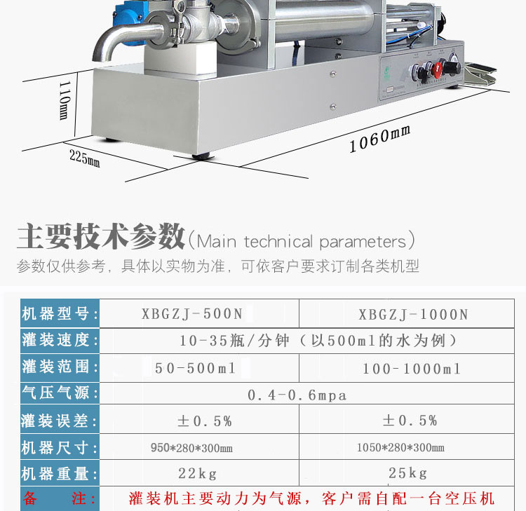 本系列灌装机主要动力为气源,客户需自配空压机;