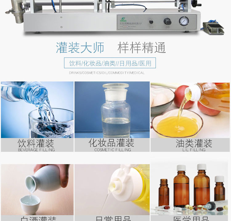 注:本机可选择定做灌装容量,可灌装0.05-5L,适用于白酒、润滑油、洗发水、沐浴露、洗手液等不含颗粒状的液体物料。该机主要动力为气源,客户需自备空压机设备
