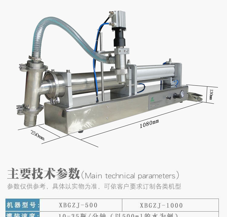 2、由于采用气动控制,并采用机械定位,所以灌装精度高,精度可以控制在±1%