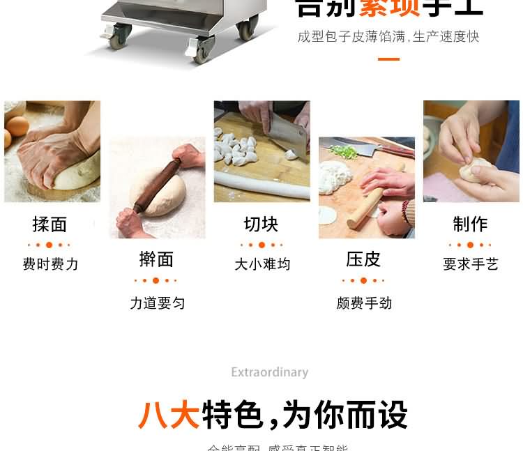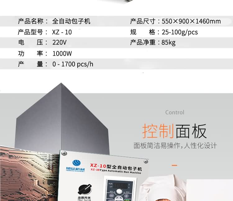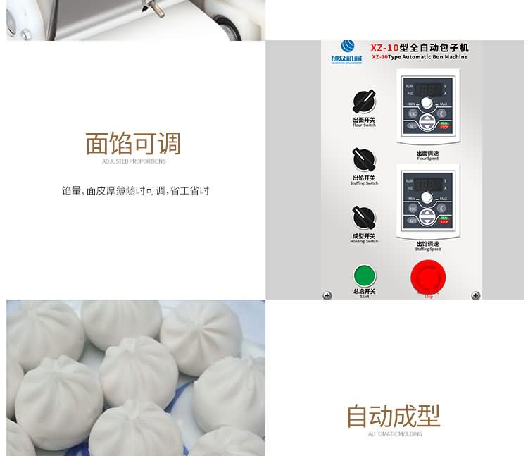 旭众牌XZ-10小型包子机是一款设计先进,结构简单,操作方便,生产性能稳定、精准的设备。其体积小重量轻,外壳及主要部件采用不锈钢制作,外观精美;可生产不同馅料的包子及南瓜饼、圆馒头等各类包馅产品,满足不同客户的要求。