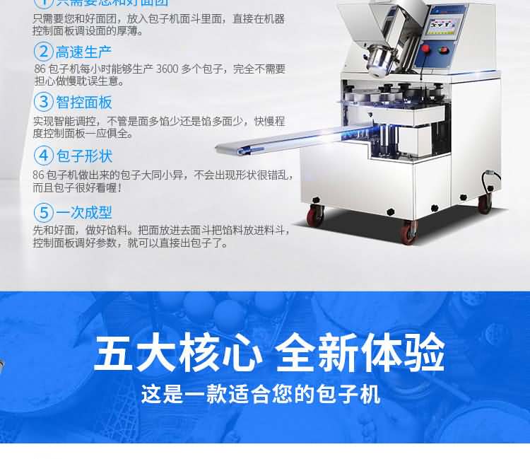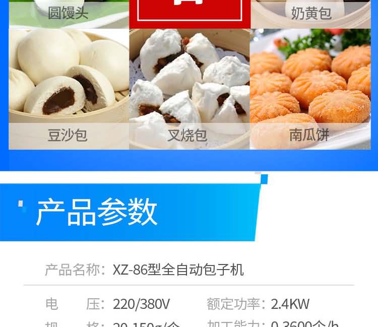 XZ-86型全自动包子机,可生产各种肉包、菜包、肉菜包、小笼包、汤包、水晶包、圆馒头、奶黄包、豆沙包、叉烧包、南瓜饼、煎堆等十几种包馅制品。适用于宾馆、饭店、学校、机关企业食堂、馒头或包子加工厂、早餐工程店及速冻食品厂等单位。可满足不同客户群体。免费提供工艺技术。免费上门培训指导安装。