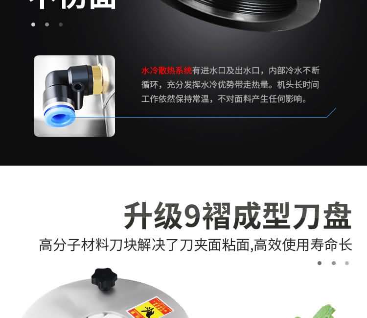 ◆出面系统:采用单搅龙,大螺径【北方机器由于加工手段受限一般搅龙很小需要转速很快才能出料】半卧式出面方式。可以在挤相同分量面皮与小搅龙相比的情况下,大大降低搅龙转速,让面皮出料压力小,达到揉面的效果,不伤面筋,口感佳!并配正副搅龙以保证出面均匀。