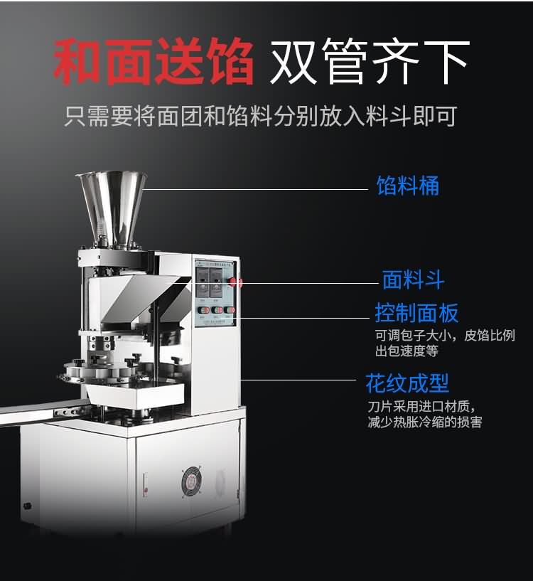 ◆送面、送馅均采用无极变速,大小及面馅比例均可调节;