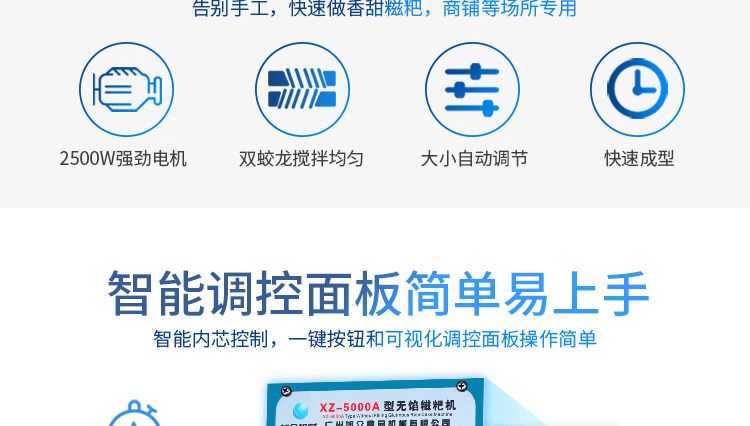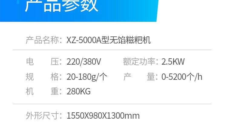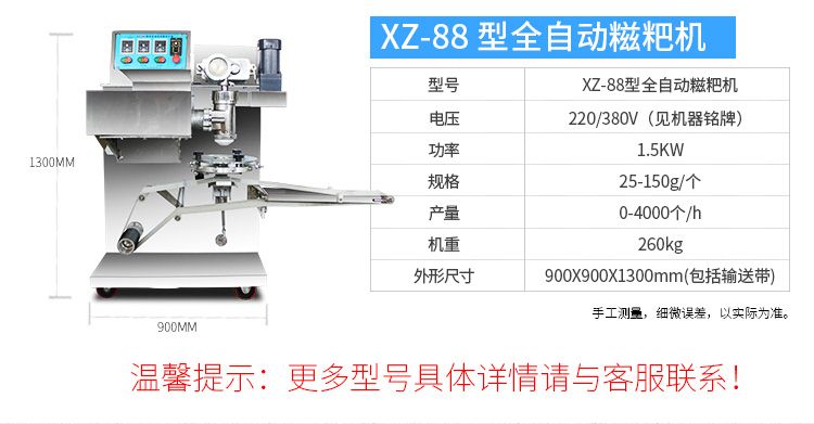 XZ-5000A型无馅糍粑机,可生产糯米糍粑、蛋酥糍粑、酥糖糍粑、板栗糍粑、黄豆糍粑、麦香糍粑等各种无馅糍粑制品。适用于商场、超市、酒店、影剧院、学校、图书城、游乐园、旅游景点等各种场所。免费提供工艺技术。免费上门培训指导安装。