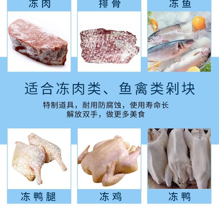 3、适用于鸡鸭鹅等禽类切块、排骨切块、冻鱼、冻肉等各种切块工作;