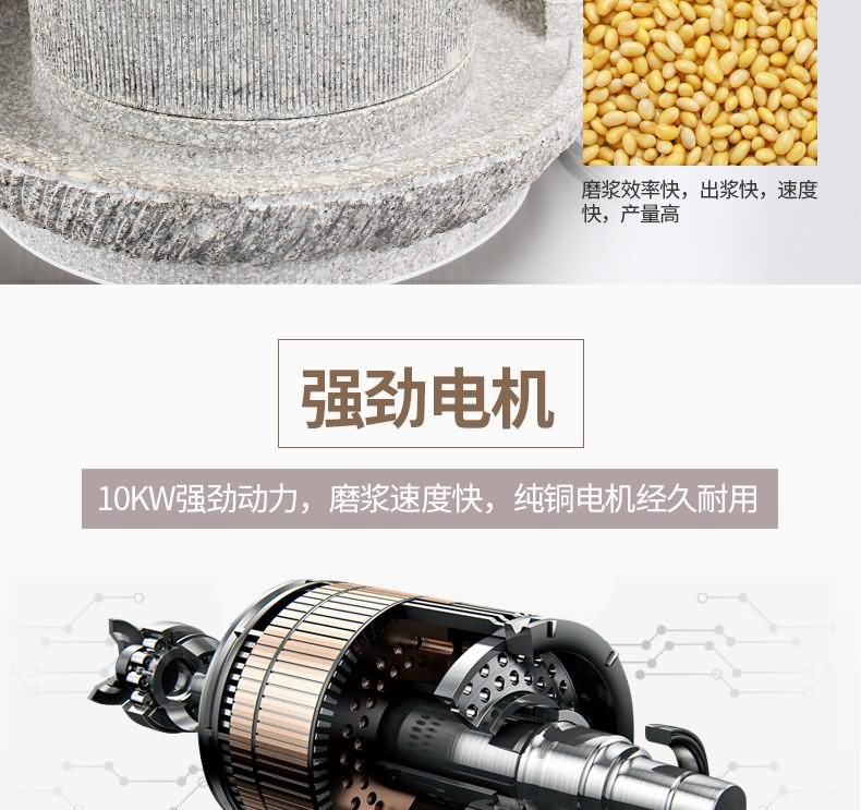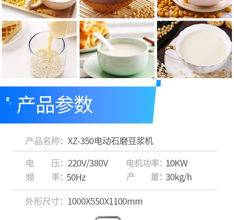 XZ-350电动石磨豆浆机,适用于制作豆浆;豆浆还含有铁、钙等矿物质,尤其是其所含的钙,虽不及豆腐,但比其他任何乳类都高,非常适合于各种人群,包括老人、成年人和青少年等等。