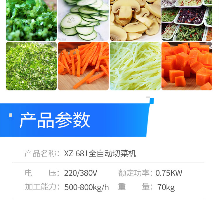 XZ-681多功能切菜机,本设备可切叶菜可切片、丝、段等,叶菜类,切割尺寸: 1 - 60mm 可以调整,适用客户群:食品厂,净菜加工;学生营养餐,餐饮连锁,中央厨房,企业食堂等。
