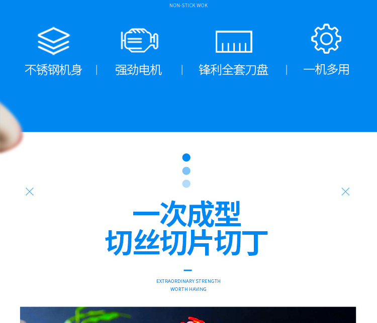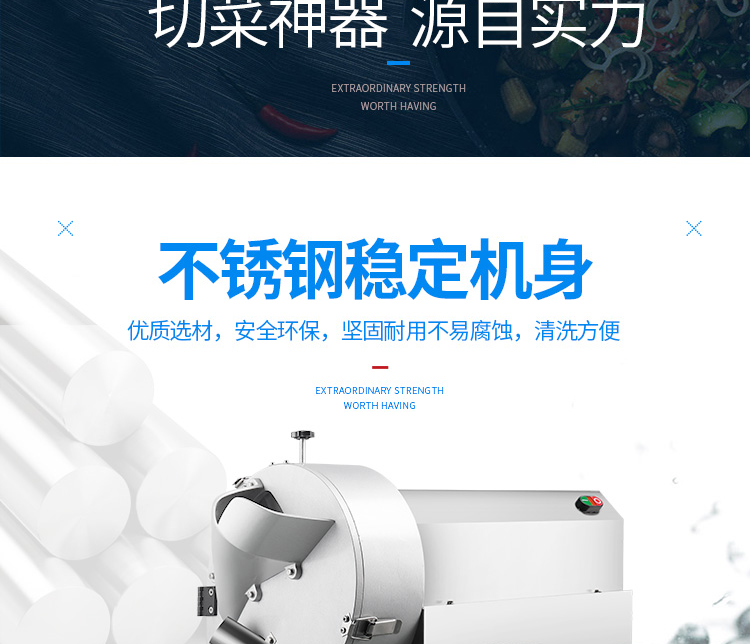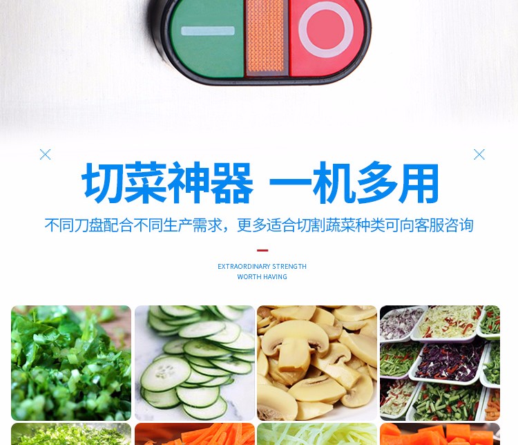 1、一机多用,根茎类蔬菜,并可切片、丝、条、丁、段等。