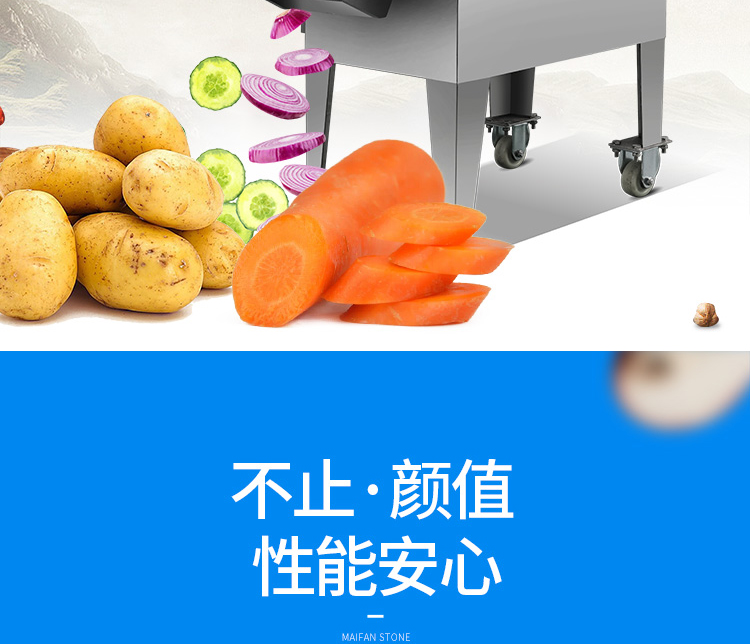 设备可将根茎类蔬菜:如马铃薯、蕃薯、黄瓜、竹笋、洋葱、茄子等切片、条、丁。