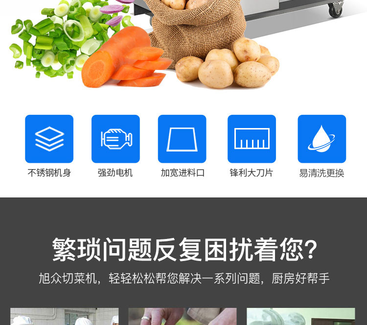用于硬、软各种根、茎、叶类蔬菜和海带的加工,可切制片、块、丝、丁、菱形、曲线形多种花样。