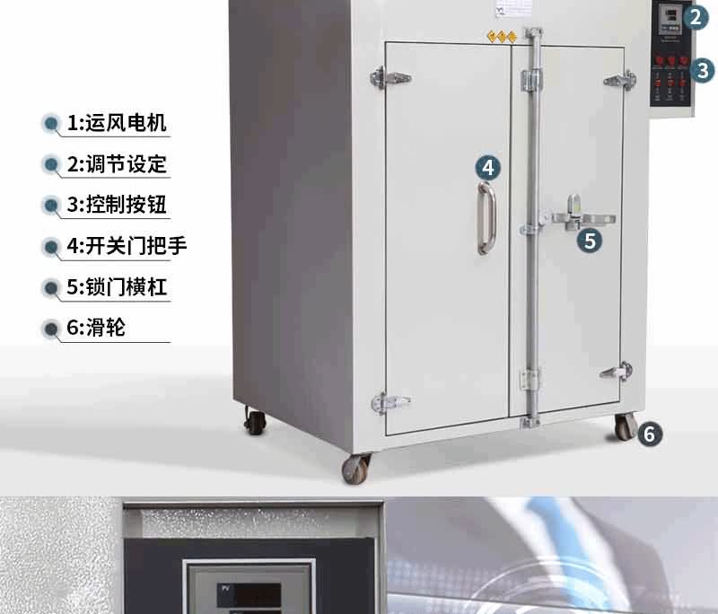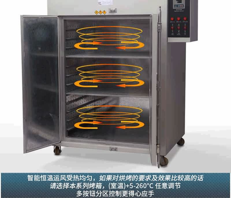 运风式智能烤箱采用大直径凤轮循环形式,因此具有循环风量大、热量流通均匀等特点,适用于工业各行业或需要烘烤面积大或数量多的产品,如电镀业、电子业、合金饰品、塑胶定型等烘干、脱水,但不适用于带强挥发性、易燃易爆等物品,以免引起爆炸。
