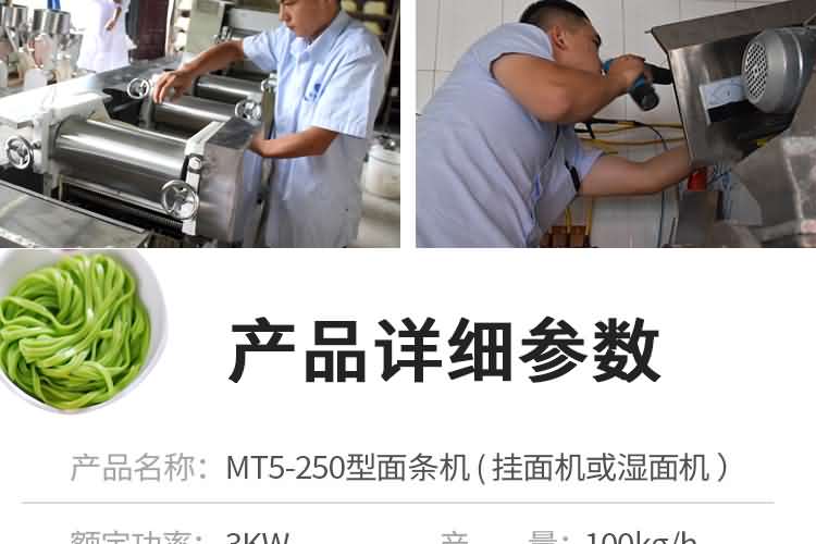 MT6-250面条机 (挂面机或湿面机) | 外形尺寸:2800×600×1400mm 产量:200kg/h 轧辊:98×260mm 功率:3kw 轧辊组数:6组 机重:550kg | 铁外壳 |