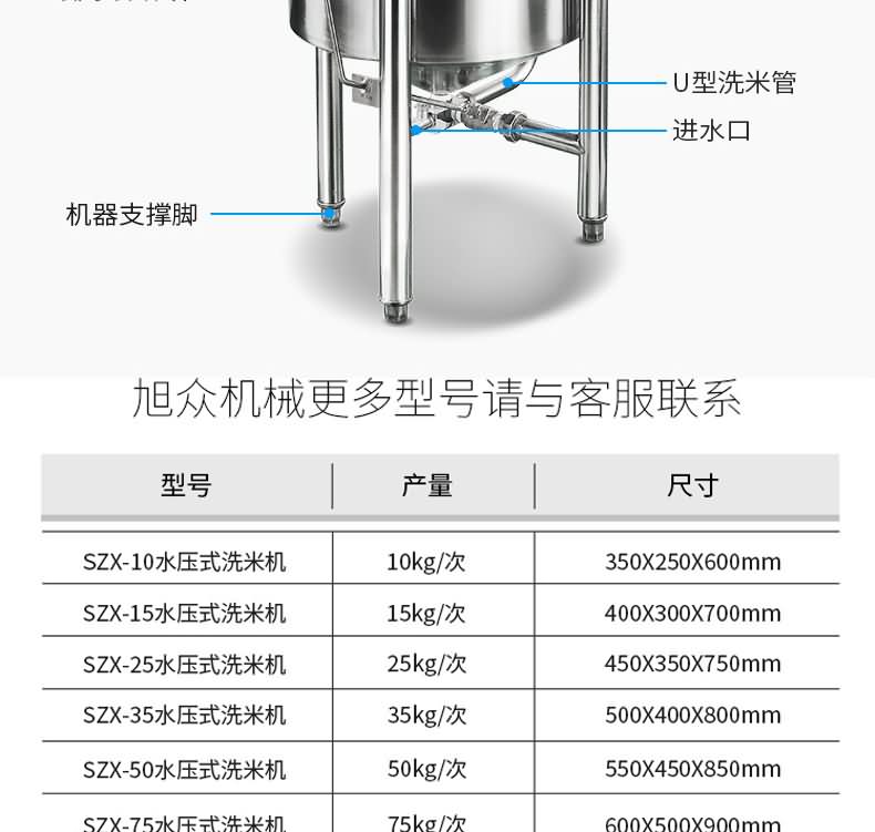 SZX水压式洗米机系列,适用于大米、小麦、玉米、豆类等颗粒粮食淘洗,在大米深度加工中,洗米是第一道工序,在传统的加工中, 洗米是手工劳动,不仅劳动强度大,而且效果差。