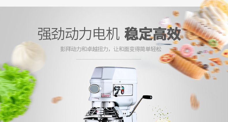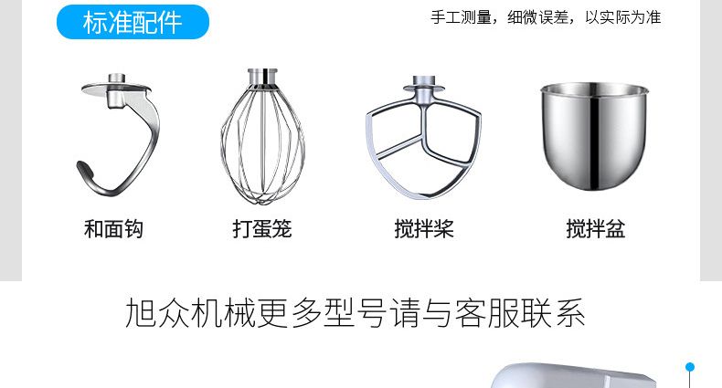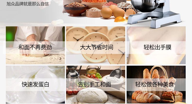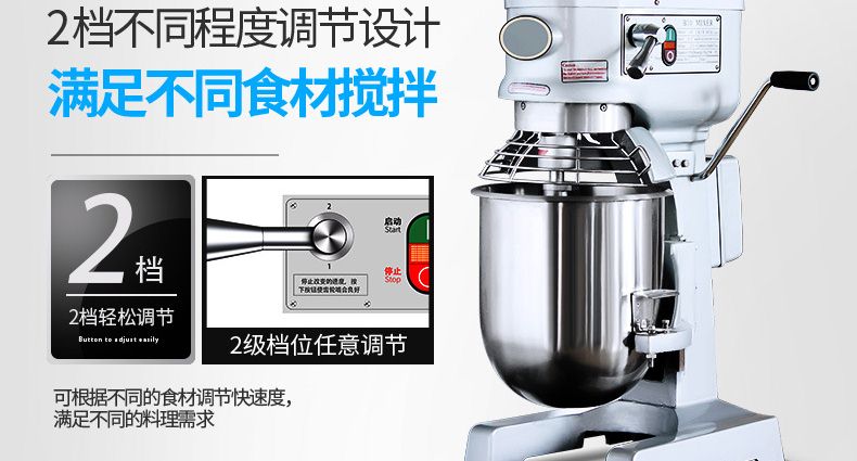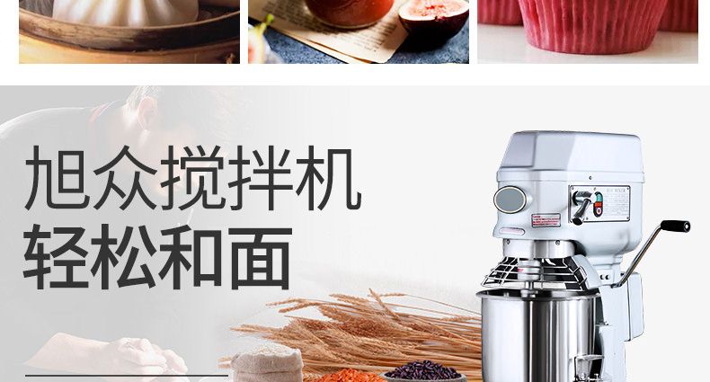 旭众牌新款A系列食品搅拌机运用行星运动原理,搅拌器在料桶内做行星运动,从而使食品充分混合,具有和面、搅和碎状。粉状及液状食品等多种功能,机器工作平稳,设有防护罩,安全可靠,设有多级转速,并配有多种搅拌器,用户可按不同要求选择适当的速度和搅拌器,以实现和面、拌馅、打蛋等功能。机内凡接触食物的零部件均采用不锈钢制造或经特殊表面处理。符合食品卫生标准。