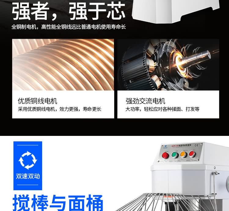 双动双速和面机是采用皮带、链条和链条传动变速,和面杆搅拌桶同时作旋转运动,该机设计合理,外型整齐美观,体积小,重量轻,噪音小.效率高,操作简单,清理方便,清洁卫生,经用户使用反映良好。该机适用于公共食堂、旅馆、宾馆、饭店、部队、招待所及学校部门等揉制面团和搅拌食物的理想加工机械。