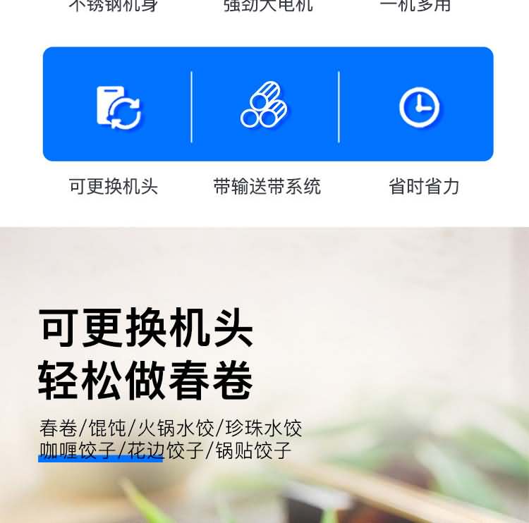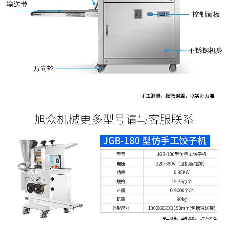 备注 | 更换机头可做春卷、馄饨、火锅水饺、珍珠水饺、咖喱饺子、花边饺子、锅贴饺子 |